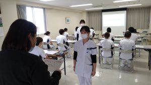 感染予防について、実技を交えて研修を受けている様子でした