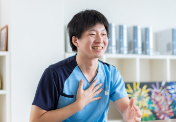 就職活動中に祖父がこちらを利用していて、お年寄りの役に立ちたいと思ったのがきっかけで高校卒業後に入社しました。先輩達に丁寧に教えてもらいながら仕事を覚えたのですが、楽しい反面、思っていたよりも体力が必要だと思いました。入社前にボランティアで訪れ、利用者さんにありがとうと涙を流された時に、心にぐっときたのですが、その時の強い印象があるから、この道に進み長く続けているのかもしれません。
