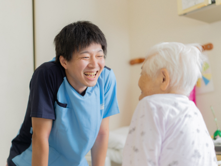 身体の介助、食事介助、オムツ交換、トイレ誘導、体調のチェックが主な仕事です。夜間は利用者さんが安心して眠れるように見回りも行います。どの場面も利用者さんの笑顔が最高にやる気にさせてくれます。介護の道に進もうと決めたのは中学2年生の時の職場体験でした。面白そうだなと思い、すぐに専門学校を探し、そこに行くために高校も選びました。やりたい事が見つかった!という嬉しさが大きかったですね。