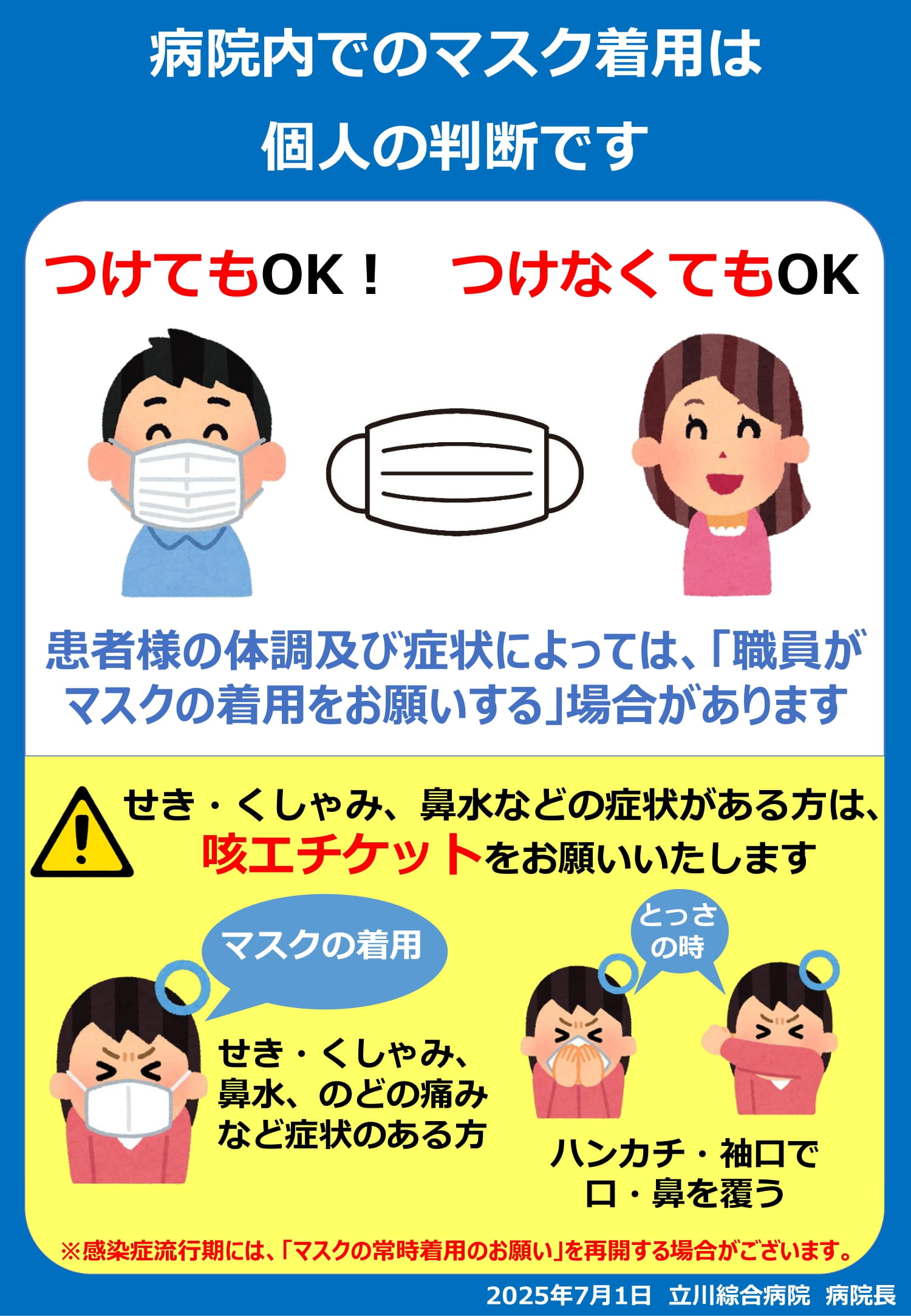 ◆病院内でのマスクの着用は個人の判断です。ただし、集中治療室ではマスクの着用をお願いします。