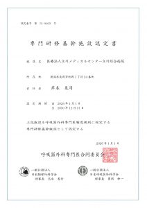 呼吸器外科専門医「専門研修基幹施設」に認定されました 2026年02月18日 2026年1月1日に呼吸器外科専門医合同委員会より専門研修基幹施設に認定されました。 新潟県内には4施設あり、新潟市以外では唯一の専門研修基幹施設です。 認定には年間150件以上の手術実績以外にも経験豊富な呼吸器外科専門医に加えて 呼吸器内科、放射線科、病理診断科の医師による手厚い体制も必要となります。 今後も患者様一人一人に向き合い、最適な医療を提供できるよう努めてまいります。